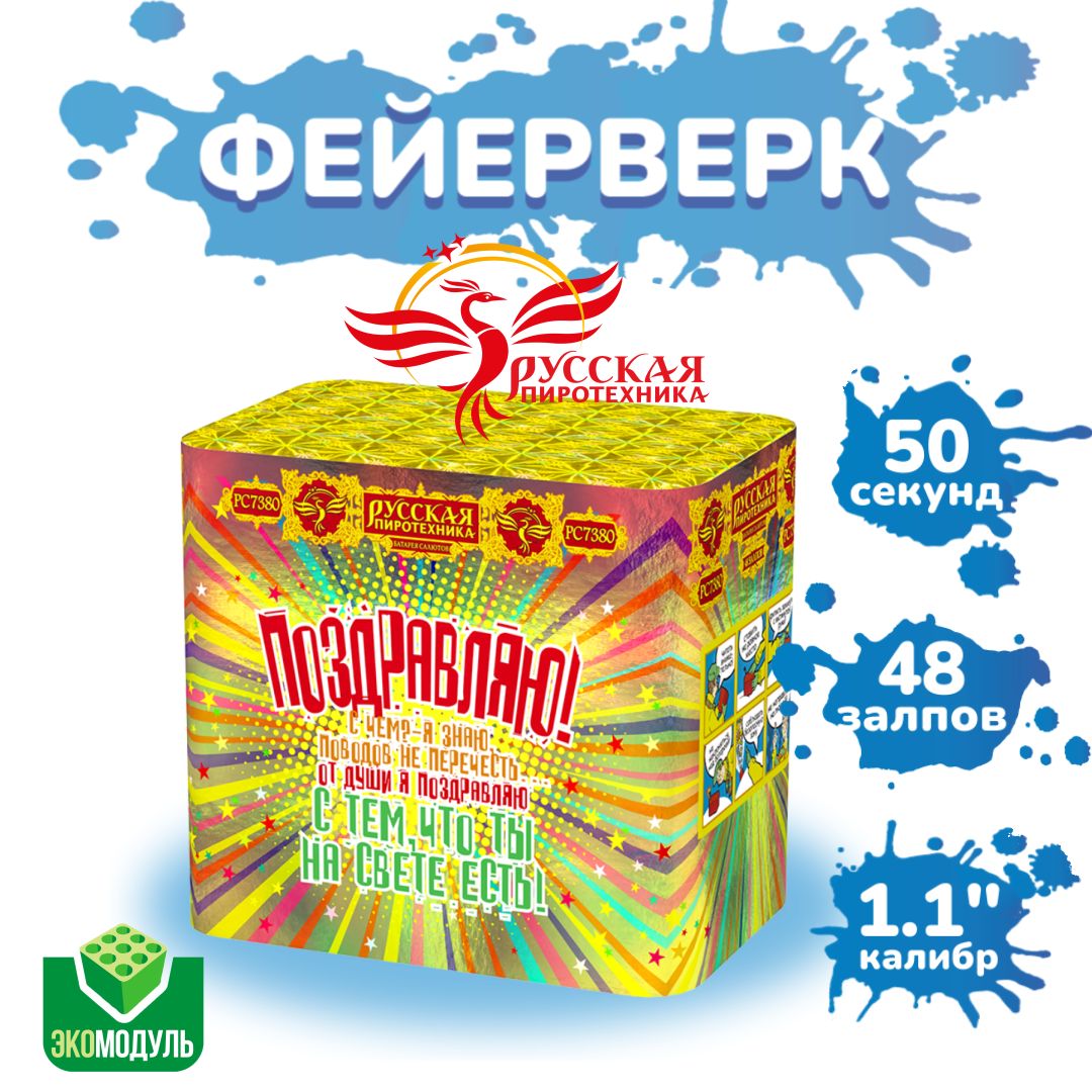 С чем? - Я знаюПоводов не перечестьОт души я поздравляюС тем, что Ты на свете есть!<br/><br/>С самого начала этого шоу Вы почувствуете волнение и восторг. Мощные взрывы заполняют небо красочными искрами, создавая потрясающие световые фонтаны различных форм и размеров. Они переливаются от ярких красок до глубоких оттенков, словно рисуя картины прямо перед Вашими глазами. Настоящий фейерверк радости и праздника от "Русской пиротехники", который превратит любой особый момент в незабываемое зрелище. Салюты всегда вызывают улыбку и восторг у всех, кто наблюдает за ними. Они создают атмосферу счастья и подарят незабываемые моменты для празднования любого особого события. Это лучший способ поздравить любимого вами человека! Эффекты (изображены на картинке): Разноцветные кометы разрываются сферами из: